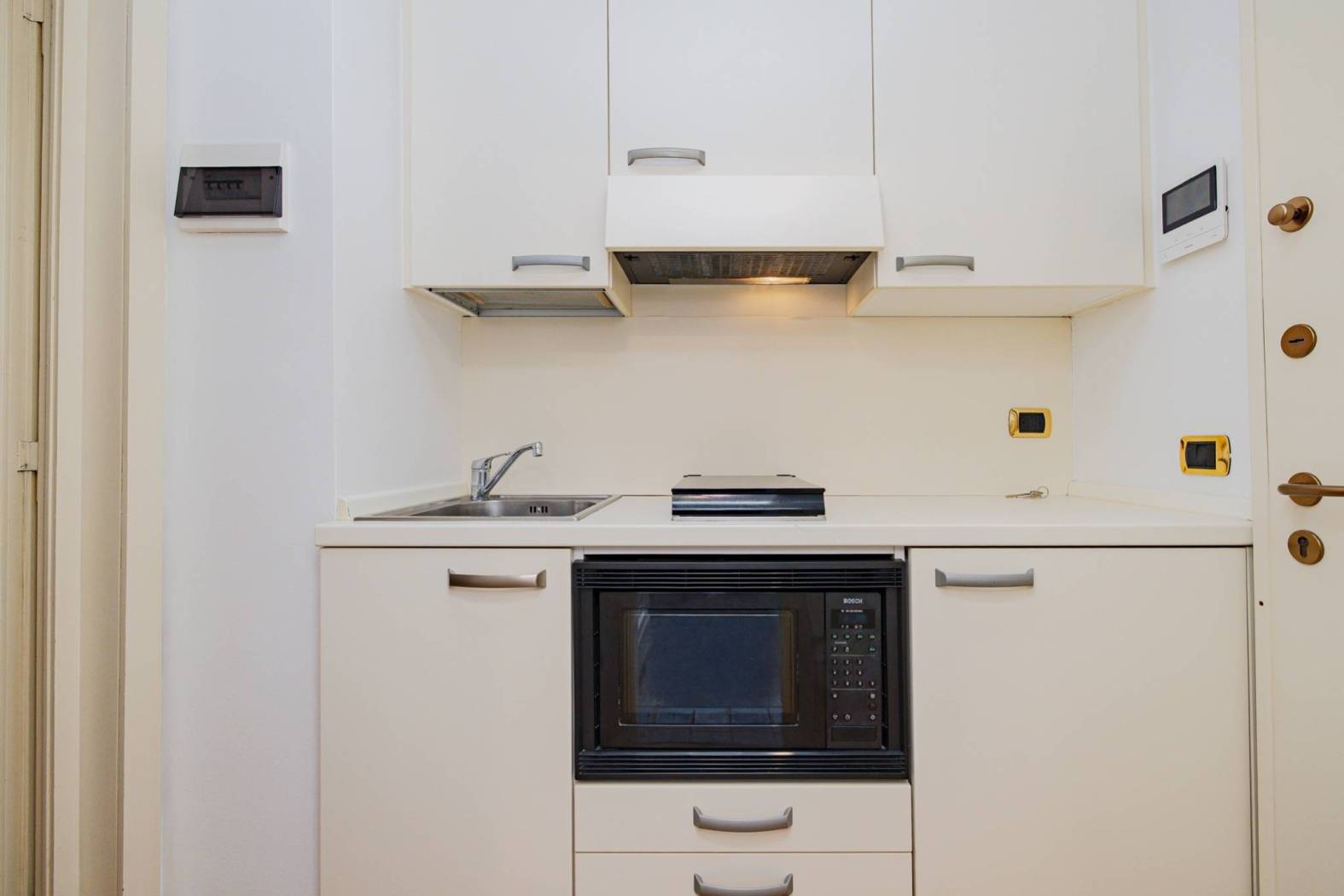 Angolo cottura attrezzato con frigorifero, piano cottura e forno a microonde